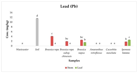 Pb is a toxic metal with no biological benefit and acts as a potent neurotoxin, causing neurological, renal, reproductive, and developmental harm, especially in children and pregnant women [,,]. In this study, Pb concentrations exceeded the FAO/WHO safe limit of 0.3 mg/kg across all vegetable species analyzed (Figure 4), underscoring widespread accumulation associated with wastewater-irrigated systems. ANOVA results revealed statistically significant differences in Pb concentrations across sample types (p < 0.05), and Duncan post hoc tests identified distinct homogeneous subsets, highlighting variation in tissue- and species-specific Pb accumulation. Soil samples exhibited elevated Pb levels (11.57 ± 0.06 mg/kg), forming a high statistical group, while wastewater samples recorded Pb below detection limits, suggesting that current irrigation practices may not be the immediate source. Instead, this points to legacy soil contamination, possibly from prior industrial emissions, atmospheric deposition, and vehicular exhausts, which are known sources of Pb persistence in agricultural soils [].