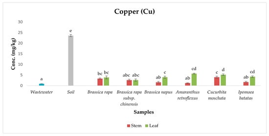 Cu is an essential micronutrient vital for both plant development and human health, supporting key physiological processes []. However, its benefits depend on concentration, as excessive levels can lead to toxicity and health complications []. In the present study, copper (Cu) was detected in all vegetable samples, with concentrations remaining within WHO permissible limits across exotic and indigenous species (Figure 5). ANOVA results showed significant differences among sample types (p < 0.05), and Duncan post hoc tests revealed clear groupings, with wastewater, soil, stems, and leaves forming distinct subsets.