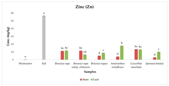 Zn is an essential micronutrient crucial for human, animal, and plant health, supporting immune function, enzyme activity, and growth processes [,]. However, both deficiency and excess can negatively impact biological functions and productivity []. In this study, Zn was detected in all vegetable samples, with concentrations remaining below the FAO/WHO safety limit of 60 mg/kg, suggesting minimal health risk and highlighting the nutritional value of the vegetables (Figure 6). Post hoc analysis revealed significant differences across sample types, with soil forming the highest statistical group, indicating it as the main Zn reservoir. Wastewater, placed in the lowest group, had a limited direct contribution during sampling. Zn levels were generally higher in leaves than stems, and indigenous species like Amaranthus retroflexus and Cucurbita moschata showed greater accumulation, likely due to their physiological traits and higher transpiration rates []. These findings suggest that while soil is the primary source of Zn, plant-specific uptake mechanisms play a key role in Zn distribution. Although current levels pose no immediate risk, the presence of Zn in all samples and its tendency to build up in soil under prolonged wastewater irrigation highlight the need for monitoring to prevent future accumulation [].