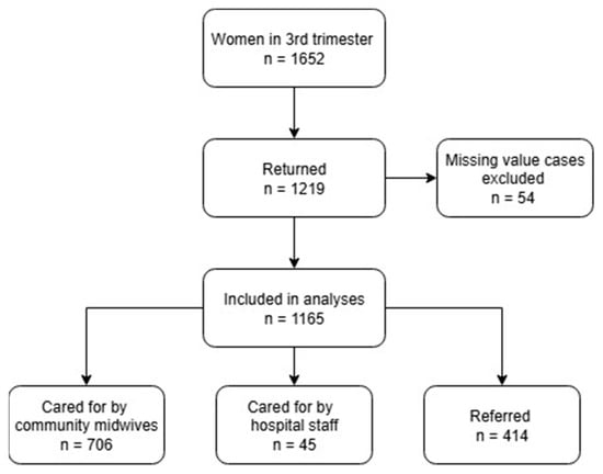 We distributed the questionnaire among 1652 women who were at least 32 weeks pregnant, and 1219 gave a response (response rate 73.8%). Because of missing values, we excluded 54 questionnaires from the analysis, leaving 1165 (70.5%) included responses. Among the participants, 706 women (60.6%) received exclusively primary care from community midwives, 45 women (3.9%) received exclusively secondary/tertiary care from hospital staff, and 414 women (35.5%) received both primary care from midwives and secondary/tertiary care from hospital staff (referred) (Figure 1).
