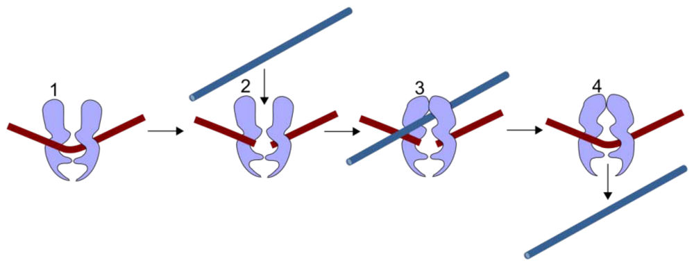 TOP2 mechanism. TOP2 cleaves both strands of a duplex DNA segment (brown, 1–2). A second DNA duplex (blue) passes through the transient enzyme-coupled break (2–3). The first duplex is then re-ligated and the products of the reaction are released from the enzyme (4).