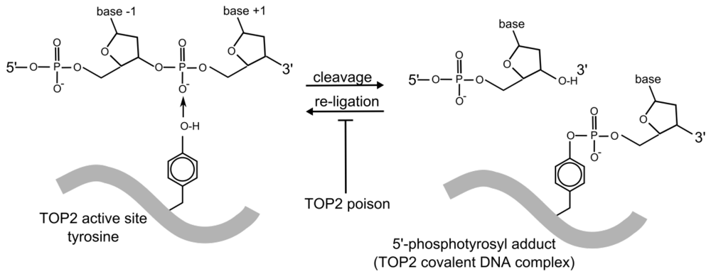 TOP2 DNA cleavage. TOP2-catalyzed strand cleavage involves a reversible, covalent enzyme–DNA adduct formed through the TOP2 active site tyrosine residue. Topoisomerase poisons inhibit the reverse reaction (re-ligation) resulting in stabilization of the 5’ phosphotyrosyl-DNA complex (cleavage complex) which contains a TOP2-linked strand breaks. The TOP2 protein molecule is represented by the thick grey line. Only one TOP2 monomer and one strand of the DNA duplex are shown.