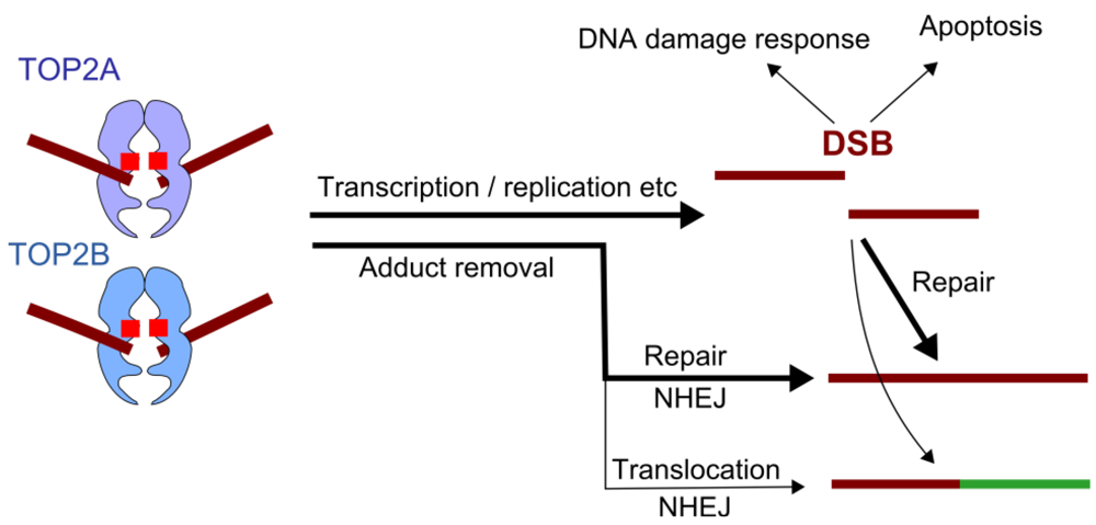 TOP2 Poisons, downstream events. TOP2 poisons inhibit the religation step of the TOP2 reaction cycle, leading to accumulation of covalent TOP2-DNA cleavage complexes. These lesions are cytotoxic and lead to activation of the DNA damage response and potentially apoptosis. Alternatively these lesions are repaired, largely through the non-homologous end-joining pathway. Translocations observed in therapy-related leukemia are presumed to occur as a result of mis-repair, joining two heterologous ends.