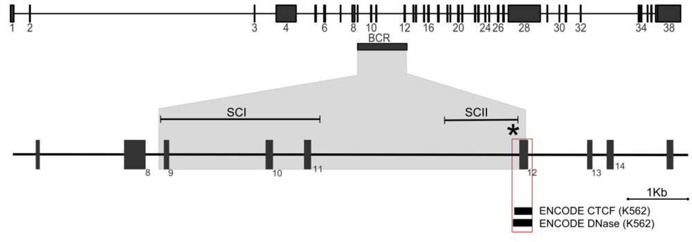 MLL translocations. Top: Genomic organization of the MLL gene, exons are numbered. Horizontal rectangle, breakpoint cluster region (BCR). Bottom: Enlarged segment of the MLL locus encompassing the breakpoint region. SCI and SCII denote BCR subclusters in which de novo AML and t-AL/neonatal translocation breakpoints are concentrated respectively [45]. The asterisk denotes a “hotspot” where nine tightly clustered therapy related or neonatal breakpoints have been reported. The red-boxed region highlights a peak of CTCF binding and DNase I hypersensitivity observed in the publically available ENCODE data (http://genome.ucsc.edu/cgi-bin/hgGatewa [56,57,58]).