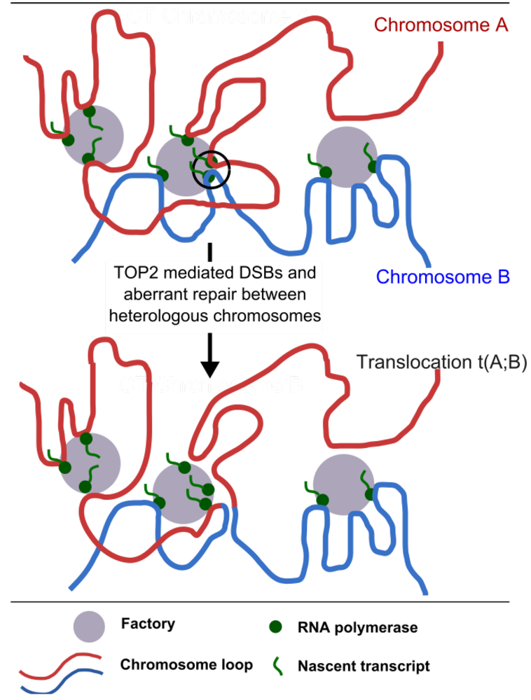 Transcription occurs at dynamic structures called factories or hubs [69] consisting of multiple active RNA polymerase complexes each engaged with a transcription unit (gene) [70]. The dynamic association of genes with these focal sites of transcription results in looping and loops are presumed to form as transcription initiates, remain associated while transcription proceeds and then redistribute as transcription terminates (Figure 5). Since interphase chromosomes occupy distinct territories in the nucleus [68], transcription units derived from proximal regions of the same chromosome are likely to share transcription factories with the greatest frequency. However, high resolution FISH has demonstrated significant intermingling of chromatin between adjacent chromosome territories [68]. As a result genes residing on different chromosomes can simultaneously associate with common transcription factories, as has been demonstrated using RNA FISH to visualize sites of ongoing transcription [71,72]. In the context of hematological malignancies, the Igh and Myc genes (which are involved in translocations in B-cell lymphoma such that the proto-oncogene Myc is driven by the active Igh promoter) frequently share sites of transcription in stimulated mouse B cells [73]. Thus, sharing of transcription factories combined with transcription-associated TOP2-poison mediated DSBs could provide both the DSBs and the juxtaposition required for chromosome translocation (see Figure 5) in therapy related leukemias.