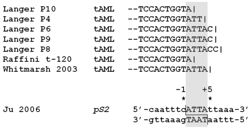 MLL translocation hotspot. MLL breakpoint sequences (der 11) from t-AL cases that form a “hotspot” near the telomeric end of the MLL BCR. The ATTA sequence is aligned with the same 4bp sequence identified in the etoposide-induced cleavage site described in the pS2 promoter [59].