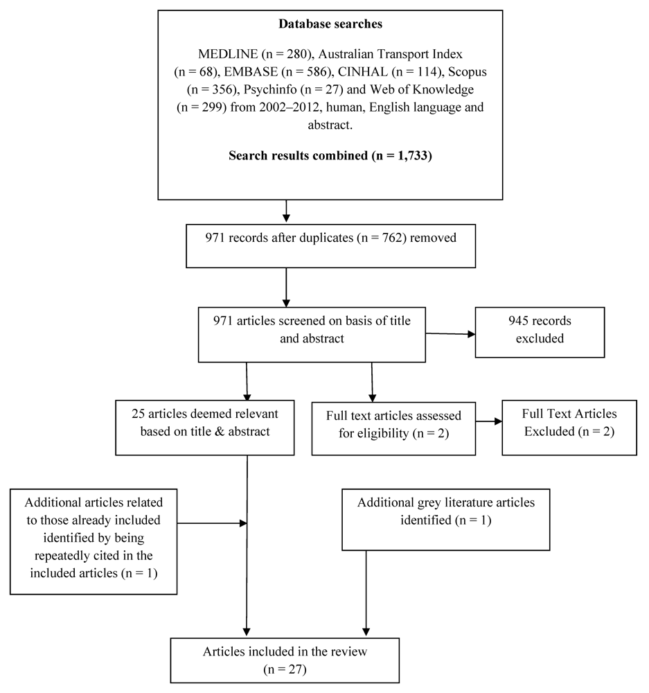 Studies were identified through searching of the following electronic databases (January 2002–2012): Medline, Australian Transport index, Embase, Cinahl, Scopus, Psychinfo and Web of Knowledge limited to humans, English language and abstract. Grey literature (including government and agency reports) was included where it was frequently cited by other papers, or was readily identified through a Google search. The search focused on three key elements: (1) Population (adults); (2) physical activity and (3) public transport. Key search terms are listed in Table 1. These terms were mapped to appropriate subject headings and searched as a keyword in each database. All articles were imported into an Endnote library and duplicates removed (see Figure 1).
