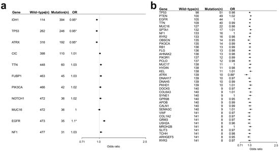 Frequencies of mutated and wild-type genes and logistic regression results showing the relationship of mutations with age in patients with lower grade glioma (a) and glioblastoma (b). Genes shown have mutation rates >5%. OR, odds ratio; *, significant.