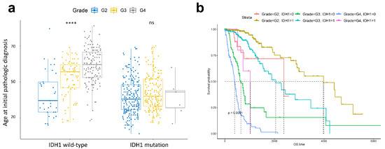 Comparison of tumour grades of patients with IDH1 wild-type and IDH1 mutation with respect to age at initial pathologic diagnosis. p-value <0.0001 are indicated by ****. ns is not significant (a). Survival analysis comparing patients with IDH1 wild-type or IDH1 mutation in each tumour grade. 0 indicates wild-type; 1 indicates mutation. Time up to which 50% patients survived is shown by the dotted line in every type. The unit of overall survival (OS) time is day (b).