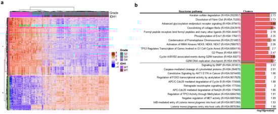 Heatmap with hierarchical tree of patients by gene expression pattern with information gain (IG) over 0.35. The top annotations show tumour grade and mutation status (IDH1 mutant or wild-type). WT indicates wild-type; MT indicates mutation (a). Statistically significant results of the pathway enrichment analysis of gene clusters in the IDH1 hierarchical group (b).