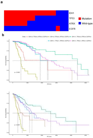 Mutational patterns of IDH1, TP53, ATRX, and EGFR in the hierarchical tree (a). Survival analysis of patients with mutant or wild-type genes in terms of overall survival and progression-free survival (b). 0 indicates wild-type; 1 indicates mutation.
