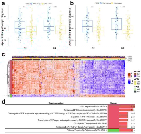 Comparison of patients harbouring ATRX and TP53 wild-type and mutation with age of glioma onset at initial pathological diagnosis in the background of IDH1 mutation. p-values less than 0.001 and 0.0001 are shown by *** and ****, respectively. As the number of glioblastoma (GBM) patients with IDH1 mutation is few, GBM is excepted in analysis (a,b). Heatmap with the hierarchical tree of patients by gene expression pattern with information gain (IG) over 0.35. The top annotations show the grade and mutational status (mutant or wild-type) of ATRX and TP53. WT indicates wild-type; MT indicates mutation (c). Statistically significant results of pathway enrichment analysis of gene clusters in the ATRX and TP53 hierarchical group (d).