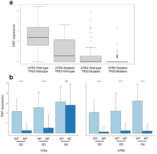Variation in TERT expression level with the mutation statuses of ATRX and TP53 in tumours with IDH1 mutation (a). TERT expression level in tumours with IDH1 mutation with separated mutation statuses of ATRX and TP53 for each grade. WT indicates wild-type; MT indicates mutation. p-values < 0.0001 are shown as ****. ns is not significant (b).