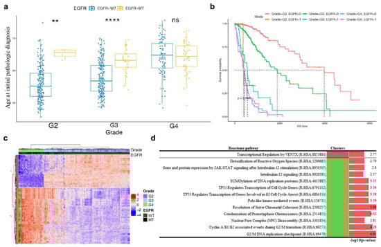 Comparison of ages at initial pathological diagnosis of tumours with EGFR wild-type and those with EGFR. p-values <0.0001 are shown as ****. p-values <0.01 are shown as **. ns is not significant (a). Survival analysis comparing EGFR mutant or wild-type and each grade with overall survival. 0 indicates wild-type; 1 indicates mutation. The unit of overall survival time is day (b). Heatmap with hierarchical tree of patients based on gene expression pattern with IG over 0.35. Top annotations show tumour grade and genotype (mutant or wild-type) of EGFR. WT indicates wild-type; MT indicates mutation (c). Statistically significant results of pathway enrichment analysis of gene clusters in the EGFR hierarchical group (d).