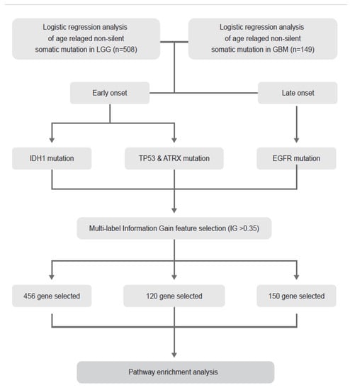 The following are available online at https://www.mdpi.com/article/10.3390/curroncol28030210/s1, Table S1. The results of logistic regression with gene mutations of which frequency is over 5 percent and age in the lower grade glioma. OR is odds ratio. 2.50% and 97.50% is boundary value of 95 percent confidence interval. Table S2. The results of logistic regression with gene mutations of which frequency is over 5 percent and age in the glioblastoma. OR is odds ratio. 2.50% and 97.50% is boundary value of 95 percent confidence interval. Table S3. The position of mutation. Table S4. Multiple logistic regression analysis between age and age-dependent somatic mutations with adjusted gender and KPS. Table S5. The log-rank p-value in Grade and IDH1 mutation. Grade compares groups of IDH1 mutation and IDH1 wild-type in each grade. Mutation compares groups of grades in IDH1 mutation and IDH1 wild-type. Table S6. The results of multi-label feature selection information gain of IDH1 and grade. Table S7. The proportion of patients divided by mutation status. The mutation status information is suggested as IDH1-TP53-ATRX-EGFR. WT is wild-type. MT is mutation. Table S8. The log-rank p-value in each four age-related mutation. OS is overall survival. PFI is progression free interval. Table S9. The results of multi-label feature selection information gain of ATRX, TP53, and grade. Table S10. The results of multi-label feature selection information gain of EGFR and grade.