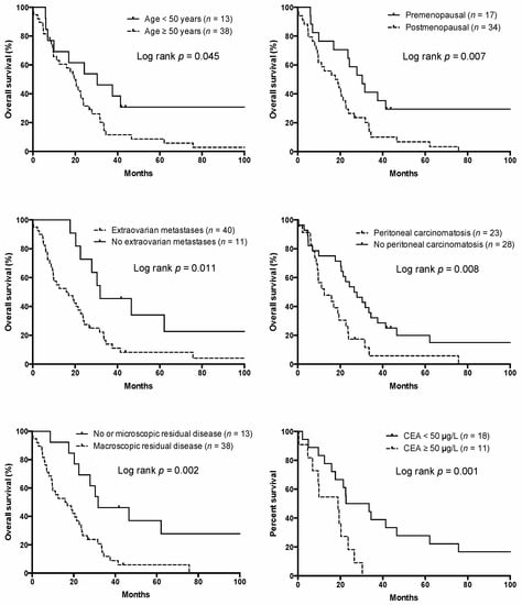 At the time of analysis, six patients were alive, with a median follow-up time of 81.1 months (range 26.9–183.5 months), while 45 patients had died. The median OS was 20.5 months (range 0.1–183.5). In a univariable Cox regression analysis, age, menopausal status, topology of the primary tumor, the presence of extraovarian metastases, peritoneal carcinomatosis, CEA serum concentration (<50 µg/L vs. ≥50 µg/L), signet-ring cell morphology, and residual disease after cytoreductive surgery, administration of systemic therapy, and the use of targeted therapy were identified as potential prognostic factors for OS (Table 3 and Figure 1). Univariable analysis on a subgroup of 29 patients identified a CEA serum concentration ≥50 µg/L as a prognostic factor for OS (p = 0.001, HR = 3.47, 95% CI 1.16–10.32).