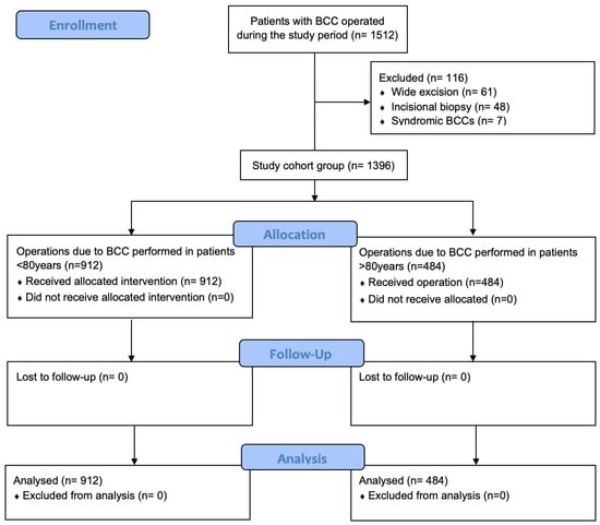 Study flow diagram of BCC excision in patients >80 years and <80 years old; n = number of operated BCC cases.