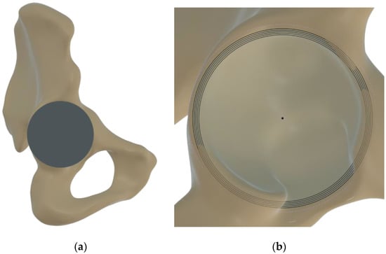 After receiving Institutional Reviewer Board approval, the computer tomography (CT) scans of human pelvises were acquired from the database of a Level 1 trauma center, excluding subjects with previous pelvic surgery, acetabular column or ilium fractures, osteoporotic bone, sclerotic bone, and hip dysplasia. The tridimensional reconstruction of the bone was performed using Slicer3d [] and smoothed in Autodesk Meshmixer with a solid accuracy of 0.75 mm. The resultant model was then exported in Fusion360 (Autodesk, San Rafael, CA, USA) for virtual instrumentation of the acetabular cup. An orthopedic surgeon trained in total joints replacement performed acetabular cup templating through frontal and lateral views of the pelvis (see Figure 1a). Following the positioning, preserving the position of the cup apex in relation to the bone, values of reaming were imposed from 54 to 58 mm in 1-mm increments through Boolean operations (see Figure 1b).