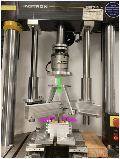 The obtained pelvic models were then machined out of 20 pounds per cubic foot (PCF) (0.32 g/cm3) solid rigid polyurethane foam (Sawbones, Vashon Island, WA, USA) as previously adopted for pelvis models in mechanical testing []. The obtained bone surrogate models were then tested using an Intron 8874 mechanical testing machine (Instron, Norwood, MA, USA) equipped with a custom-made fixture. The latter was made by a rigid frame connected to the Instron crosshead that hosts four THK low friction rails (THK Co., Ltd., Tokyo, Japan) disposed radially in the plane parallel to the plane of the templated cup. The linear guides were centered on the templated cup and each of them allowed the radial displacement in the cup plane of a rigid arm shaped as the quarter portion of a hemispherical cup. The simultaneous expansion of these quarter portions was actuated through rigid brackets connected to the Instron actuator. This mechanism converted the axial movement in the radial expansion of the acetabulum in correspondence of the templated acetabular cup (see Figure 2). The expansion was imposed while preserving the position of the cup center that was also kept the same among all the considered reaming diameters.