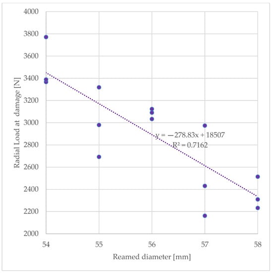 Radial load at rim damage was affected by the reamed diameter (p = 0.01) and was measured to be 3508 N ± 227 for the smallest reamed diameter of 54 mm and reduced to a value of 2352 N ± 146 for the largest reamed diameter of 58 mm. Increased reaming diameters that induced a thinning of the acetabular wall were found moderately correlated to the radial load at damage (R2 = 0.716, see Figure 3)