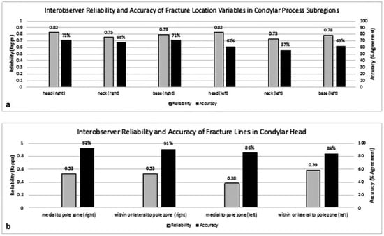 (a) Level 3—Interobserver reliability and accuracy of fracture location in condylar subregions. (b) Level 3—Interobserver reliability and accuracy of fracture location within the condylar head (m-type fractures vs. p-type fractures).