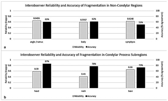 (a) Level 3—Interobserver reliability and accuracy of fragmentation in noncondylar mandible regions. (b) Level 3—Interobserver reliability and accuracy of fragmentation in condylar subregions. Left and right measures have been averaged.