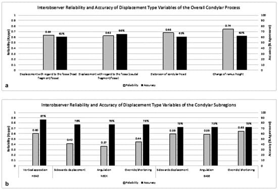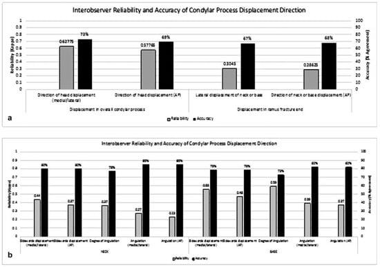 (a) Level 3—Interobserver reliability and accuracy of displacement direction of the condylar head fragment (left) and the caudal fragment (right). Left and right measures have been averaged. (b) Level 3—Interobserver reliability and accuracy of displacement direction variables of condylar process subregions. Left and right measures have been averaged.