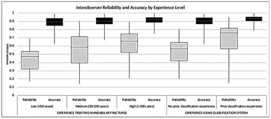 The 15 assessors had various levels of experience both in treating mandibular fractures and in using the CMF fracture classification system. We compared interobserver reliability and accuracy of the assessors by levels of clinical experience and AO CMF fracture classification experience. The assessors were divided into three groups based on the number of treated mandibular fractures (low <50, mid 50–100, high >100). A Kruskal–Wallis test was used to examine differences in reliability and accuracy according to treatment experience. Only three of the fifteen assessors had prior experience with the classification system software, while the remaining twelve had not used the software previously. Comparisons of reliability and accuracy of those with and without prior classification experience were evaluated by Wilcoxon’s rank-sum test.