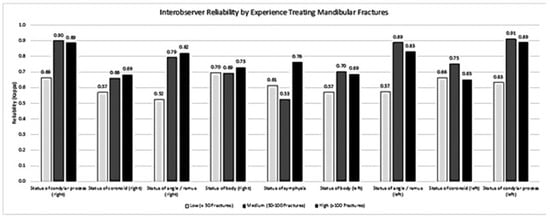 Interobserver reliability of fracture location in the mandibular regions (level 2) by clinical experience treating mandibular fractures.