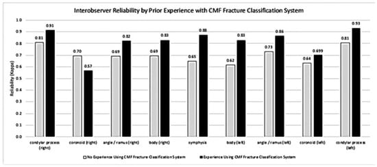 Among the nine level 2 fracture location variables, more clinical exposure was generally associated with higher interrater reliability (Figure 8). Reliability ranged from moderate to very high kappa values. Similarly, assessors who had prior experience using the AO CMF fracture classification system also had higher measures of interrater reliability, except for when evaluating the fracture location in the right coronoid (Figure 9). Reliability was moderate to very high, ranging from 0.57 to 0.93.