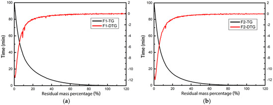 Figure 9 shows the comparison of the four soot TG curves. It is clear in Figure 9 that after the beginning of the oxidation, the mass loss of soot sample in F2 condition was the fastest, and the mass loss in F3 was slightly slower than that of F2. The residual mass percentage curves of F1 and F4 were almost overlapped. In the early stage of oxidation, the oxidation rate of F1 was higher than that of F4. However, after twenty-third minutes the two curves intersected and the oxidation rate of F4 was higher than that of F1.