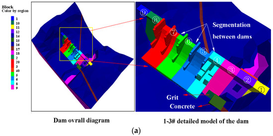 A dam model was built using the discrete element method, as shown in Figure 3a, a Mohr-Coulomb constitutive model was adopted for the rock mass, and the structural plane was constructed using a Coulomb-slip constitutive model. The Capulin San Pablo hydropower station dam foundation is perpendicular to the river cross section (1-1 section) and the river cross section (2-2 section), as shown in Figure 3b. The main structural plane of the dam foundation and the segregation characteristics between the dam sections are shown in Figure 4. The model of the structural stability of the dam sections 1–3 is simulated in detail based on the developed structural plane of dam sections 1–3 by taking into account rock classes III1B, III 2B, IV2c, and V with other rock layers and structural faces C01, C05, C06, C10, and C18 with other structural effects. The monitoring points on the upper and lower dam and on both sides of the UG7 upper and lower disc layouts are shown in Figure 5.