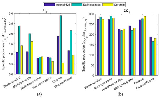 In Figure 2, the specific gas yields are reported in terms of grams of gas per kg of biomass fed. Such representation makes it clear that the preferred product is CO2, the production of which, in terms of yields, can explain the largest amount of gas mass produced. It can be observed that CO2 yields for the ceramic reactor are comparable to those of the other two reactors.