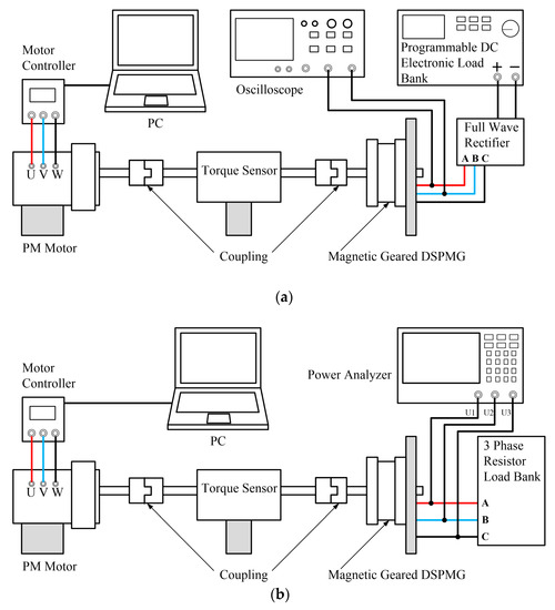 The MG generator was tested in two experimental modes, as illustrated in Figure 10 to obtain the DC power characteristics and AC power characteristics. For the DC power measurement setup shown in Figure 10a, a 5 kW brushless PM motor as the prime mover with maximum output torque of 20 Nm was coupled to the prototype and driven by a motor controller connected to a PC. The three phase AC output of the generator was connected to a DC programmable electronic load bank using a full bridge rectifier. Torque and speed were measured at the input prime shaft of the magnetic geared generator using a torque and speed sensor. The DC voltage and DC current were measured at the output of the generator using the programmable electronic load and their product was used to measure the DC power dissipated by the generator for various loads. The MG generator was tested by varying the DC load resistance from 10 to 300 ohm at constant prime rotor speed ranging from 50 to 500 rpm.