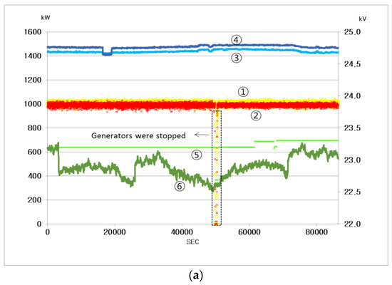 In Table 3, the reference for all values is the point at which the REG is connected to the DL. A is the case when the synchronous generators are connected without any reactors. The voltage rise rate is 3.78%, so it is necessary to install a reactor. The maximum capacity of the grid-connected synchronous generator to guarantee the permissible voltage rise rate without installing a reactor can be calculated using Equation (4) and 1.55 MVA. B is the case when the 613-kVA reactor calculated using Equation (5) is installed. The voltage rise rate is 2.22%, so the capacity of the reactor should be increased to meet the 2% voltage rise rate. C is this case and a 705-kVA reactor is installed. D is the case for the real implementation in this paper, in which an 860-kVA reactor is installed considering the margin because the power factor of REG is not fixed.
