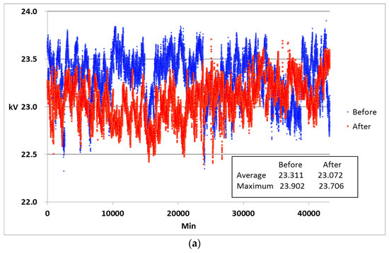 Thirdly, the monthly average grid voltage data before and after installing the reactor are analyzed. Similar to the second test, the same month is chosen to provide the same test condition. Figure 13a–c shows the monthly average grid voltage before and after installation of the reactor. The average grid voltage without the reactor is 23,279 V on average, whereas it is 23,047 V with the reactor, i.e., the reactor results in the voltage decrease of 233 V.