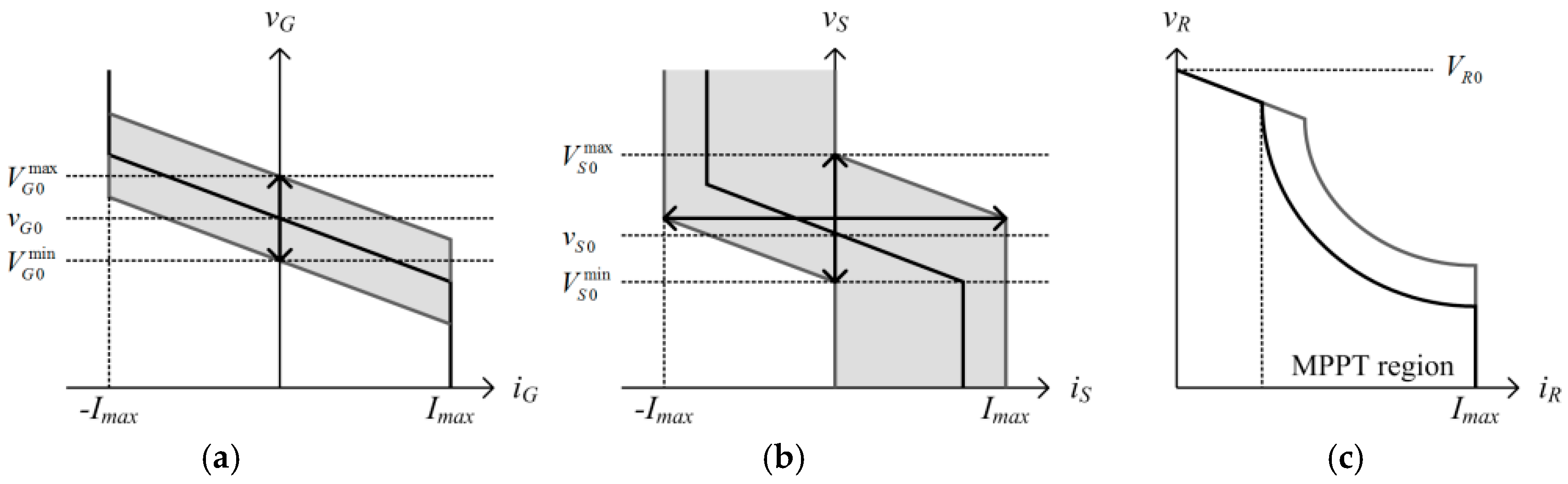 Droop characteristics in V–I curves of (a) grid-interfaced converter (GC); (b) storage converter (SC); and (c) renewable energy source (RES) converter (RC).
