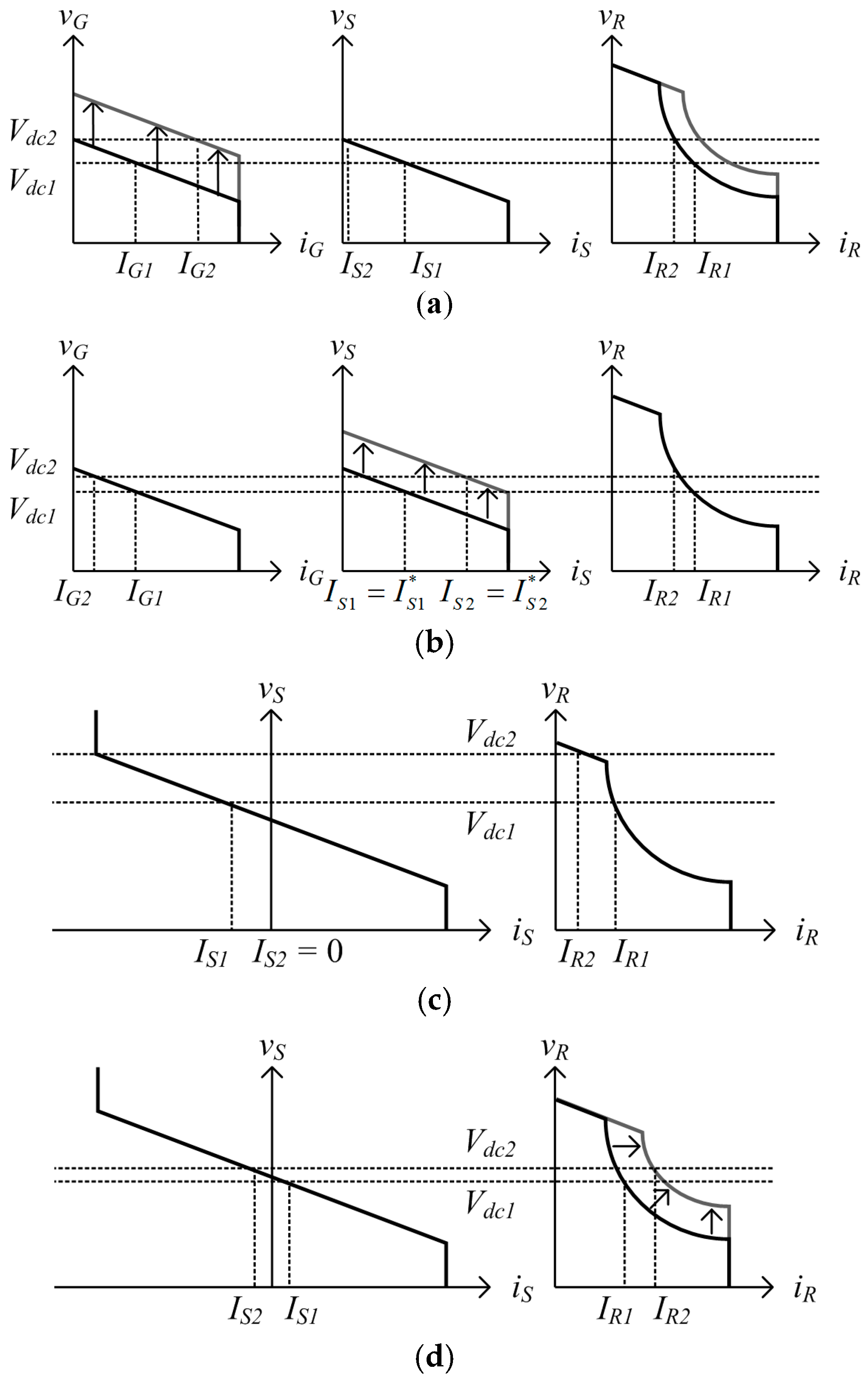 in which vdc is the dc bus voltage, and iL is the total dc load current. In this subsection, several examples of system operation will be described to highlight the features of the proposed control scheme. This series of examples shows operational transitions, in which IG, IS, and IR are the steady-state currents of the GC, SC, and RC, respectively, and vdc is the steady-state dc bus voltage. In the following examples, shown in Figure 3, the steady-state value vdc1 moves to vdc2 after the relevant transitions, and the other values shift accordingly. Assuming constant load consumption, the following relationship is satisfied.