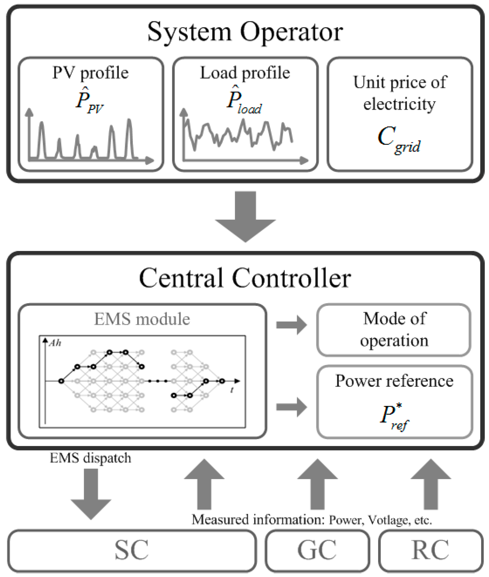 As shown in Figure 1, the central controller shares the communication bus with the local controllers. Table 2 shows the information that the central controller processes for each local controller. In this section, the EMS feature of the central controller is highlighted. Inputs from the local controllers for this energy scheduling optimization stage include the source and load power information and the SOC of the battery; additional inputs include meteorological and pricing information from a higher-level operator, such as a distribution system operator as shown in Figure 4. The EMS scheme is implemented using a dynamic programming method. After an optimal solution is derived by the EMS module, the central controller dispatches the EMS power reference and operation mode to the SC.