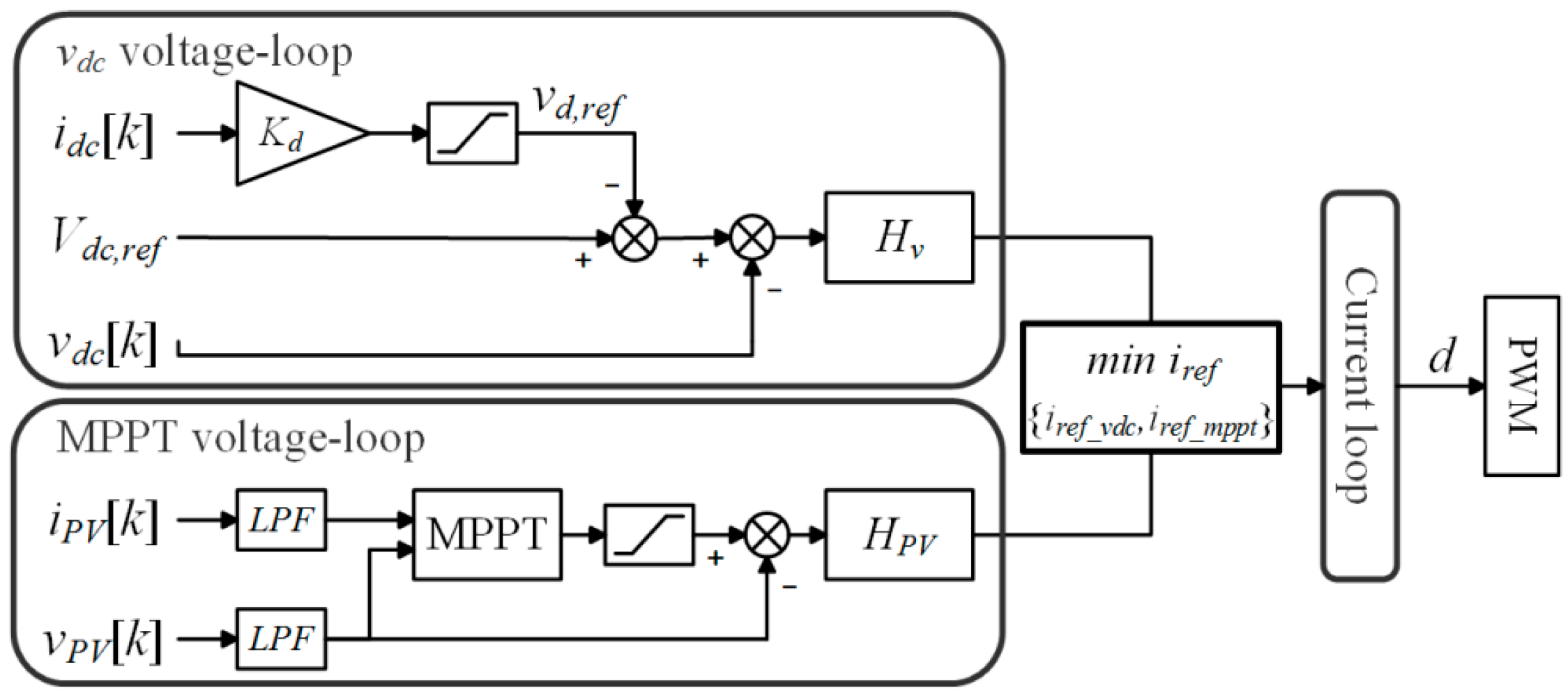 The RC’s local controller performs MPPT under normal conditions, and performs droop control of the dc voltage if off-MPPT is unavoidable. In Figure 9, the voltage-loops for both modes are operating continuously, and the current-loop references are generated. As seen in the V–I curve in Figure 2c, the reference with the lower value is selected, which is expressed by min block in the diagram. The voltage-loop compensators for the two modes are designed based on two different models in which the control objectives are the regulation of vdc and vPV, respectively.