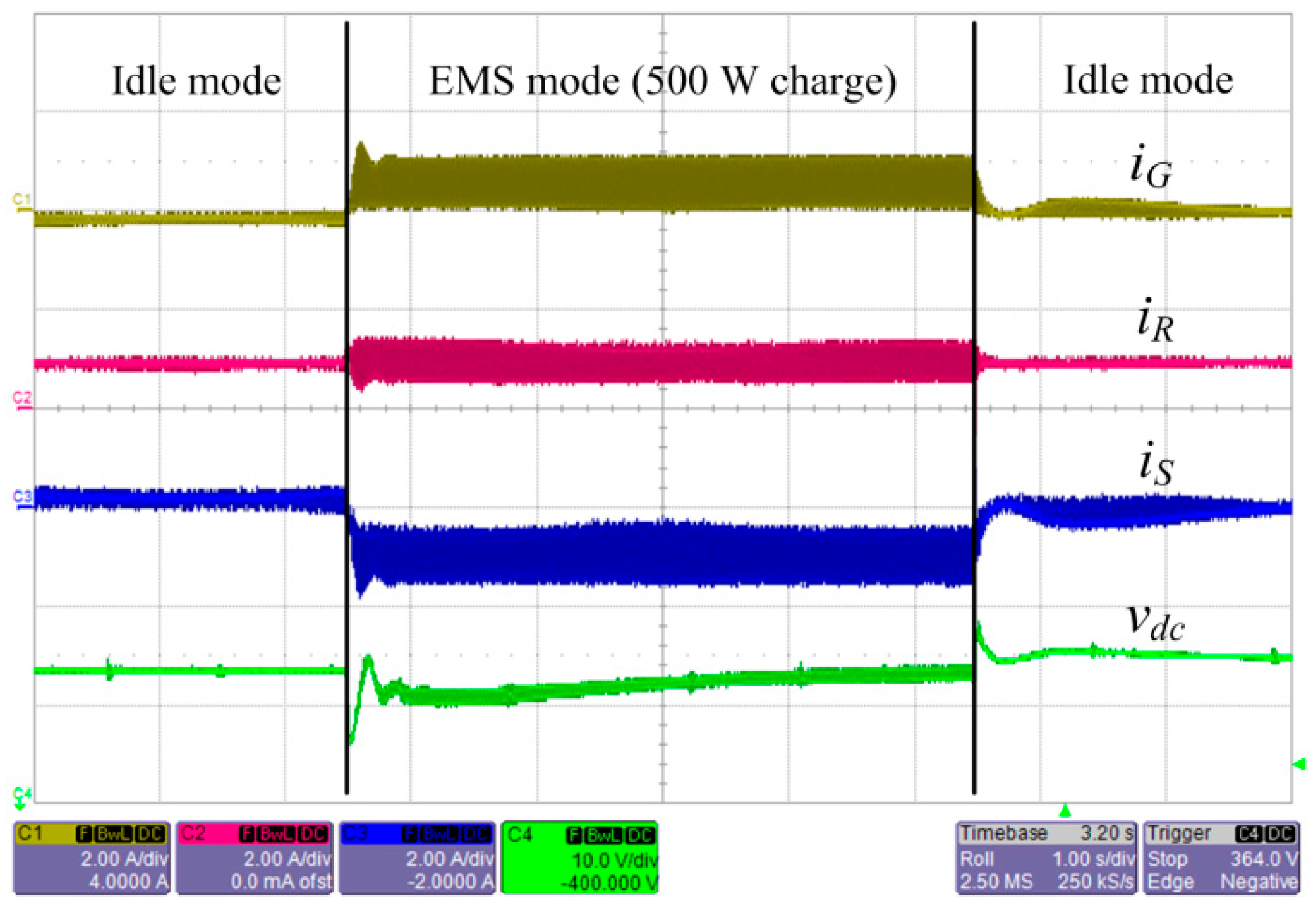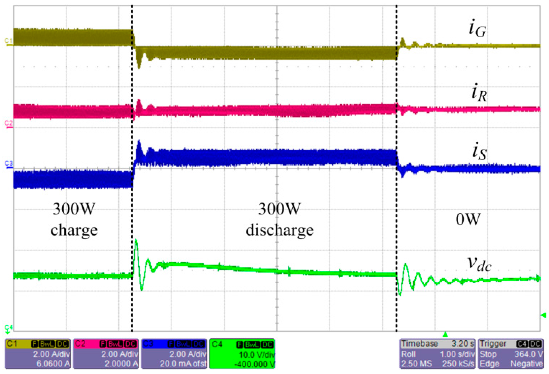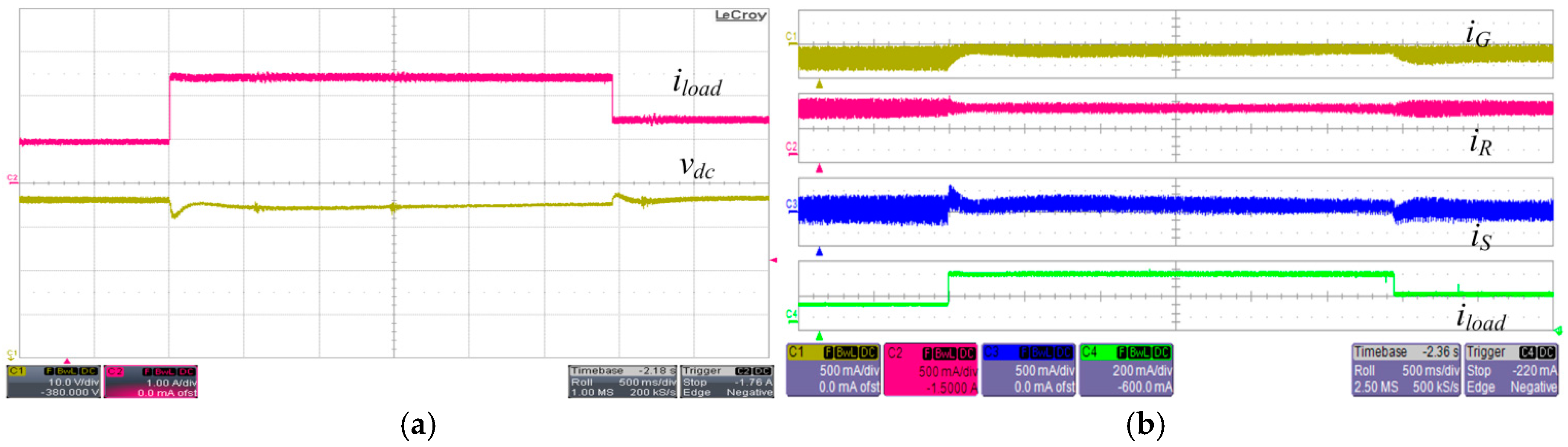 Figure 11a,b shows experimental results of load step change on State 111 with its operational description in Figure 3b. GC, SC, and RC are in the grid-connected mode, idle mode, and MPPT mode, respectively. During the load step changes from 400 W to 1 kW and from 1 kW to 600 W, with the RC output power remaining constant by performing MPPT. After each transition, the dc bus voltage fluctuates and then restores to the nominal voltage, 380 V. The dc bus voltage restoration is achieved by the slow PI controller in the GC’s local controller. It is seen that the SC’s output power remains zero, except for the transient period required to buffer the GC’s slow voltage regulation characteristic.