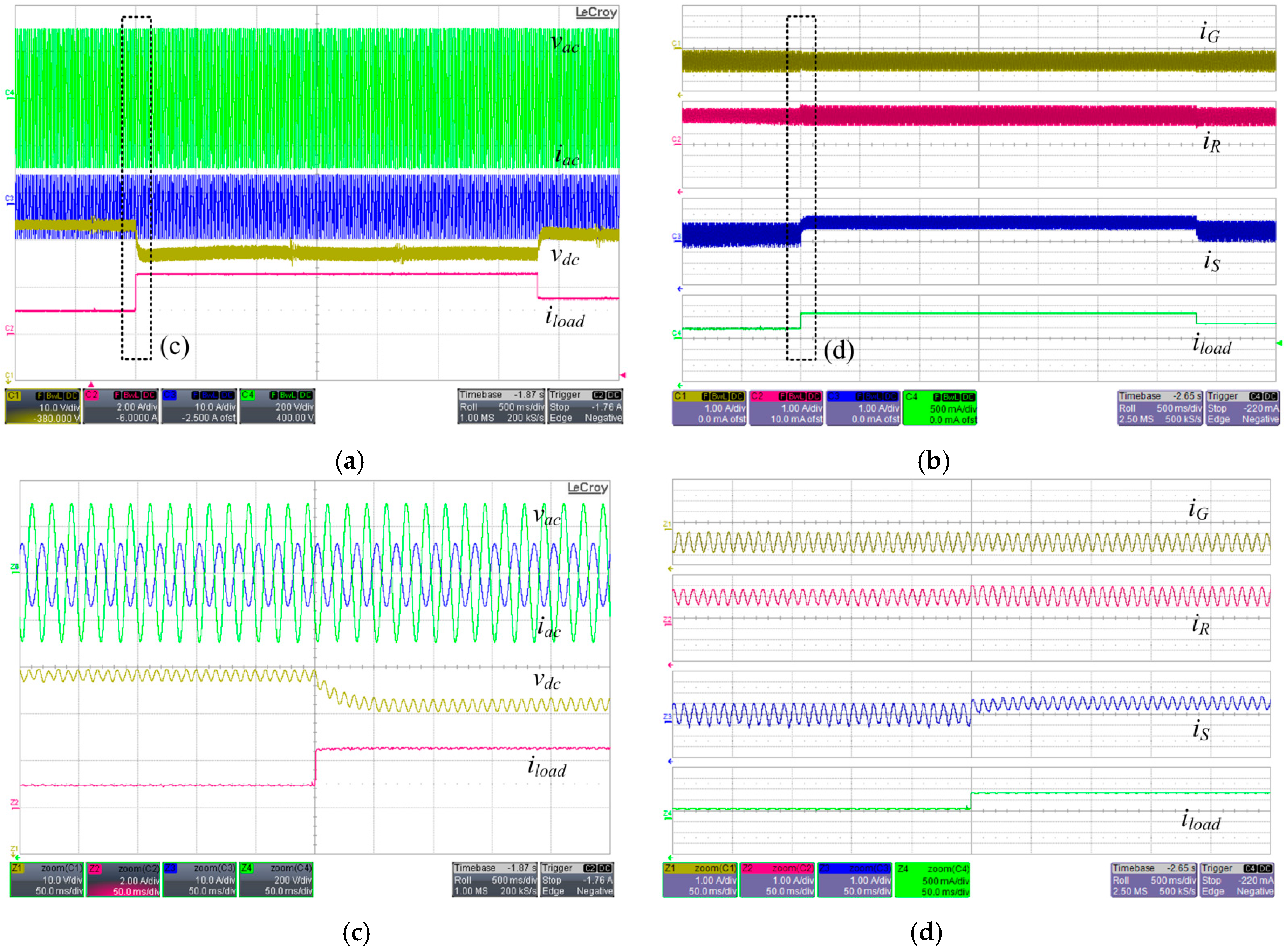 Experimental waveforms of load step change on State 211. (a) Bus voltage and current; (b) output current; (c) zoomed-in waveform of (a); and (d) zoomed-in waveform of (b).