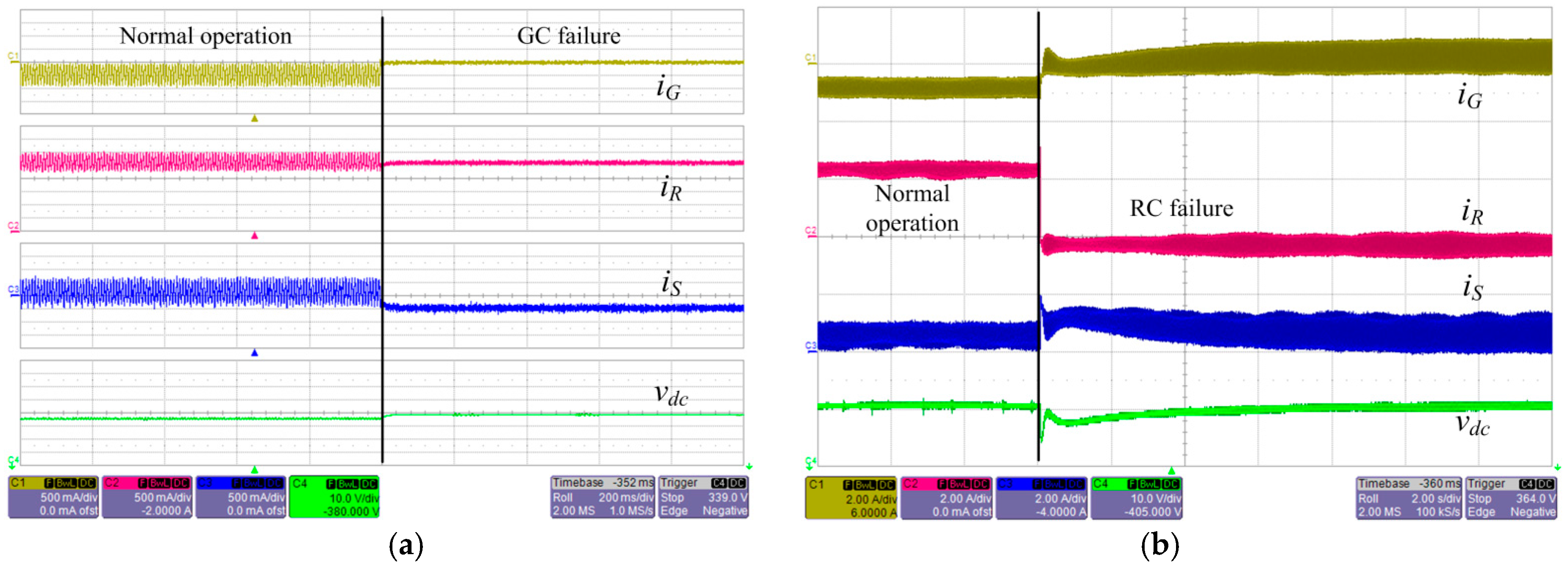 In Figure 16, the waveforms of the converters’ output currents and the dc voltage are depicted in the cases of failure of a unit. Figure 16a describes a GC failure event, and it is shown that the bus condition is maintained by the SC and RC. Whereas before the fault, the excessive power of the RC is exported to the grid through the GC, after the fault, the power charges the battery through the SC. The steady-state value of the dc voltage is increased because the dc voltage is not restored when the GC fails. In Figure 16b, whereas before the RC fault, the RC performs MPPT to supply a large portion of the total load, after the fault, the output power of the RC decreases to zero, and consequently, the GC and SC autonomously feed the loads without disrupting the operation of the system.