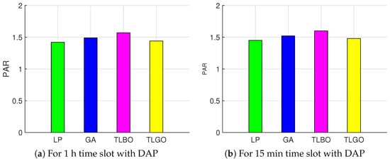 Simulation results of 1 h time slot for PAR are depicted in Figure 11a. TLBO has PAR of 1.57 whereas GA, LP, and TLGO has PAR of 1.49, 1.42 and 1.44, respectively. High PAR in case of TLBO is resulted from peak power consumption (see Figure 4a). Figure 11b shows PAR in case of DAP, whereas Figure 11c,d demonstrates the PAR for 1 h and 15 min time slots, respectively, by implementing CPP scheme. It can be seen clearly from the results that TLGO performs better in terms of minimizing PAR, showing comparable results with LP.