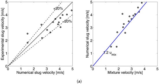 Figure 5a shows, on the left, the comparison of the slug mean velocities obtained numerically by the two-equation model and the measured ones, for the geometry Pipe1, while Figure 5b compares slug computed translational velocities, in the case of Pipe2, and the predictions given by the relation reported in [47]; their correlation (, where is the distribution parameter and is the drift velocity) is for bubble velocity, but we adopted it under the hypothesis that the slug front moves at the same speed of the bubble before it; according to [47], we consider for turbulent flow (the case of this study) and for horizontal flow. In both the cases, the agreement between the numerical results and the experimental data (or empirical prediction) is satisfactory, since they are within the lines. Moreover, at the right-hand side of Figure 5a, we show that the computed slug velocities (black rings) follow accurately the trend predicted in [47] (blue line).
