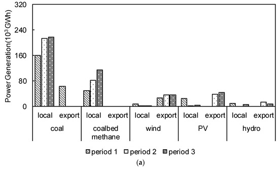 Figure 8 displays the power generation schemes output from FCFP and the least-cost model. These two models lead to the same total power generation over three planning periods (340.27 × 103 GWh in period 1384.91 × 103 GWh in Period 2, and 427.97 × 103 GWh in Period 3), but there are significant differences in the power generation sources from the two models. For example, to meet local electricity demand, the total coal-fired power generation obtained from the least-cost model would be 190.81 × 103 GWh, 231.93 × 103 GWh, and 299.30 × 103 GWh in Periods 1, 2, and 3, respectively. In comparison, the FCFP model results in coal-fired power generations would be 159.25 × 103 GWh, 213.63 × 103 GWh, and 217.27 × 103 GWh, respectively, which are significantly lower than the least-cost model. In contrast, the coalbed methane power generation obtained from the FCFP model would be 49.5 × 103 GWh, 81.54 × 103 GWh, and 113.58 × 103 GWh, respectively, which are higher than those of the least-cost model (34.91 × 103 GWh, 0 GWh, and 0 GWh, respectively). The alternative scheme from the FCFP model may be of more interest to decision makers due to its high clean energy power generation.