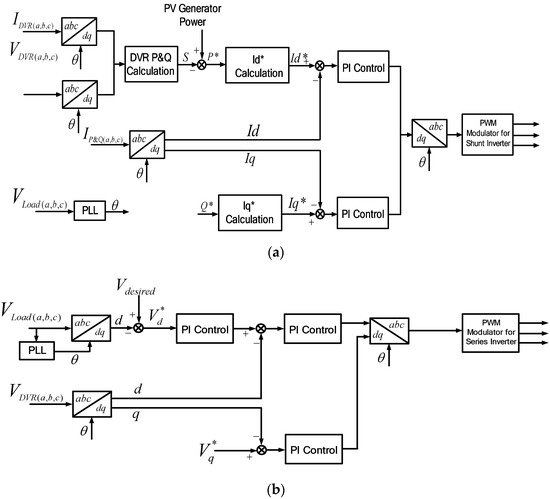 Figure 7a,b shows the control blocks for voltage compensation. Figure 7a shows the control scheme for shunt inverter. The reference currents, I*d and I*q, are generated to deliver the power through the shunt inverter, the same as the power difference between the PV generated power and the power delivered to the grid through the series inverter. Then the current-controlled PWM is applied to let the output current of shunt inverter, Id and Iq, follow this reference value. On the other hand, the reference voltages, V*d and V*q, are generated to supply the compensation voltage, and the voltage-controlled PWM is applied to regulate the output voltage of the series inverter, Vd and Vq, to follow this reference value, as shown in Figure 7b. The power flow during this mode is shown in Figure 7c.
