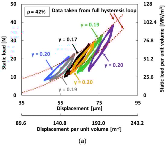 Full hysteresis loop measurements: Applied static load (left vertical axis) and static load per unit volume (right vertical axis) versus recorded displacement (upper horizontal axis) and displacement per unit volume (lower horizontal axis) for the test WMDs during loading and unloading cycles. The circle, square, and diamond symbols denote the structural stiffnesses of the WMDs with 42%, 32%, and 25% densities, respectively.