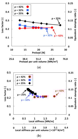 Reliable loss factors are a must to ensure the acceptable performance of WMDs. Figure 12 depicts the estimated WMD structural loss factor γ versus (a) preload FPre (upper horizontal axis) and preload FPre per unit volume of the WMD (lower horizontal axis), (b) local stiffness KLocal (upper horizontal axis) and local stiffness KLocal per unit volume of the WMD (lower horizontal axis), and (c) dissipated energy Edis (upper horizontal axis) and dissipated energy Edis per unit displacement and volume of the WMD (lower horizontal axis). In the figures, the right vertical axis displays identified equivalent damping ratio (ζeq = ~50% of loss factor, recall Section 3.2). Note that the current estimation uses the local (average) stiffness coefficients (KLocal in Figure 9) from the small local hysteresis loops as structural stiffness coefficients with the constant WMD displacement amplitude of ~12 μm. The identified loss factors range from 0.21 to 0.30. The results show the paramount effect of density of the WMDs on decreasing structural loss factor, in particular when the applied preload is relatively small. For ρ = 25% and 32%, the loss factor decreases gradually with preload. For example, γ ~ 0.30 → 0.24 for the WMD with ρ = 25% and γ ~ 0.25 → 0.21 for the WMD with ρ = 32%. On the other hand, for the WMD with ρ = 42%, the loss factors remain nearly invariant while increasing preload on the test WMD. That is, the loss factor is not sensitive to the applied preload when the WMD density is relatively large. Interestingly, from Figure 12b, the identified loss factors of three test WMDs become very similar, i.e., γ → 0.21 when KLocal > ~1.1 MN/m (or KLocal per unit volume of the WMD > ~2.8 × 1012 N/m4) for all test WMDs. For completeness, Figure 12b,c relate the identified loss factors with the WMD local stiffness and the dissipated energy. Note that loss factors of WMDs can only be determined experimentally [].