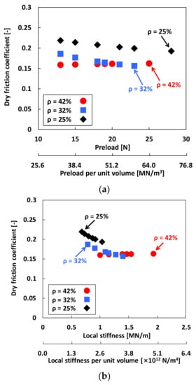 Figure 13 depicts estimated dry friction coefficients μf versus (a) preload FPre (upper horizontal axis) and preload FPre per unit volume of the WMD (lower horizontal axis); (b) local stiffness KLocal (upper horizontal axis) and local stiffness KLocal per unit volume of the WMD (lower horizontal axis); and (c) dissipated energy Edis (upper horizontal axis) and dissipated energy Edis per unit displacement and volume of the WMD (lower horizontal axis). The dry friction coefficients of three test WMDs range from 0.16 to 0.22. For the WMD with ρ = 42%, μf is nearly invariant over the entire preload ranges. On the other hand, for the WMDs with ρ = 32% and ρ = 25%, the dry friction coefficients steadily decrease from 0.19 to 0.15 and from 0.22 to 0.19, respectively, when the preload increases from 13 N to 23 N. Note that structural loss factors γ = 0.2–0.3 estimated are derived from static load tests. It is expected that, when dynamic loads with high excitation frequency are applied, loss factors are lower than the currently identified values due to a kinetic dry-friction coefficient. Figure 13b,c provide more complete knowledge relating the estimated dry friction coefficient with the WMD local stiffness and dissipated energy in the test dampers.